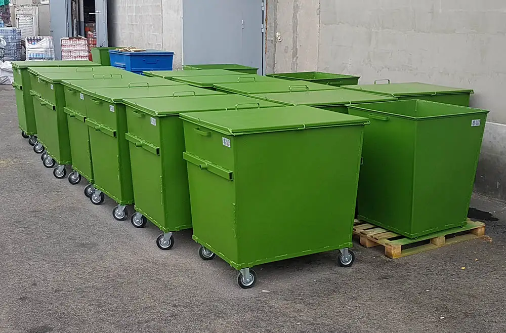 2-х поточный контейнер мусорный изготавливается из металла и имеет внешнее защитное покрытие, предупреждающее коррозию – эмаль, оцинковка или полиэтилен низкого давления. Он имеет двухколесное исполнение, оснащается крышкой и педальным управлением. Его объем обычно находится в пределах от 770 до 1100 литров. Широко востребованы универсальные евро контейнеры объемом от 120 до 360 литров. Их внутренняя емкость разделена решеткой, позволяющей видеть, куда бросать мусор определенного типа, не нарушая установленных норм.