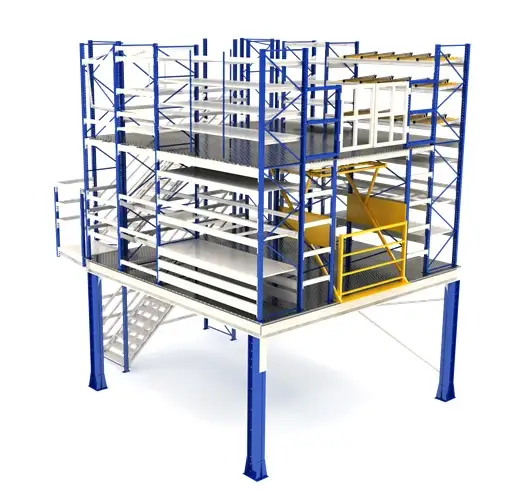 2.Отдельностоящий. Это уже серьезная система, которая формируется в соответствии с индивидуальными требованиями заказчика. Помимо самих стеллажей может дополняться зоной для инвентаризации, подсобными помещениями, верстаками и прочими. Монтируется на специальных подъемных колоннах, поэтому обеспечивают простой и удобной эксплуатацией. Изготовление сложное, но для серьезных производственных помещений является лучшим решением. Цены наиболее высокие, равно как рациональность расходов.