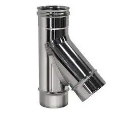 Отечественные и зарубежные производители комплектующих для дымоходов выпускают два типа тройников, которые отличаются между собой углом наклона ответвления. Патрубок может крепиться к основной трубе под углом 45 или 90 градусов.
