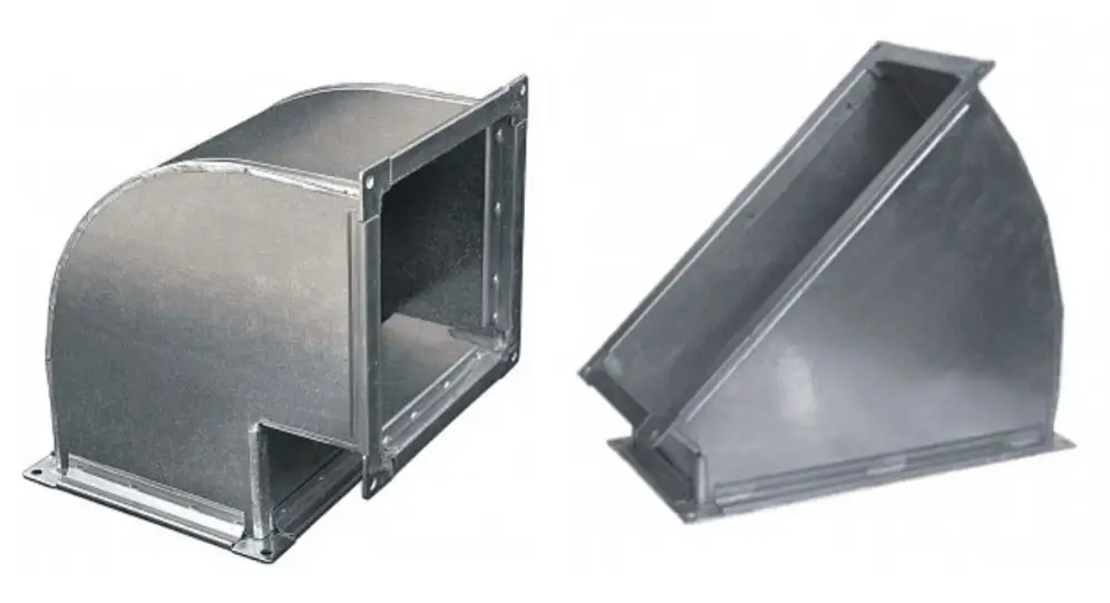 Отводы воздуховода прямоугольного сечения считаются обязательными комплектующими для вентиляционных сетей разного типа и назначения, в том числе: